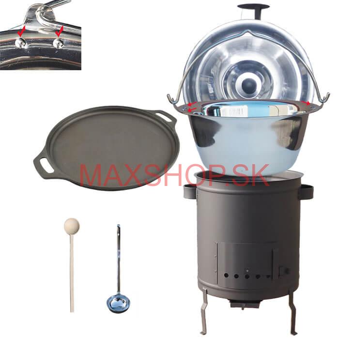 - Nerezový kotlík 20 L (0,8 mm) zosilnený s nitmi + Liatinová panvica 43 cm + hrubostenná (1,5 mm) a žiaruvzdorná kotlina 42 PLUS 600