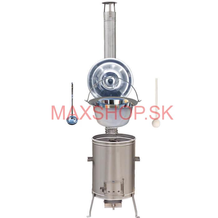 Kotlíková gulášová súprava obsahuje:   Nerezový kotlík Objem: 30 L. Horný priemer: 53 cm. Dolný priemer: 35 cm. Výška: 28 cm. Hrúbka: 1,2 mm. Materiál: nerezová oceľ (antikorová úprava - INOX).   Antikorová pokrievka Priemer: 48 cm. Materiál: nerezová oceľ (antikorová úprava - INOX).   Nerezová kotl... celý popis