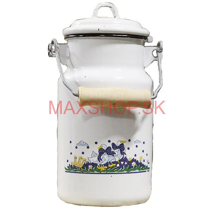 Smaltovaná konvica na mlieko. Materiál: smalt, vzor: kačičky. Objem: 1 L