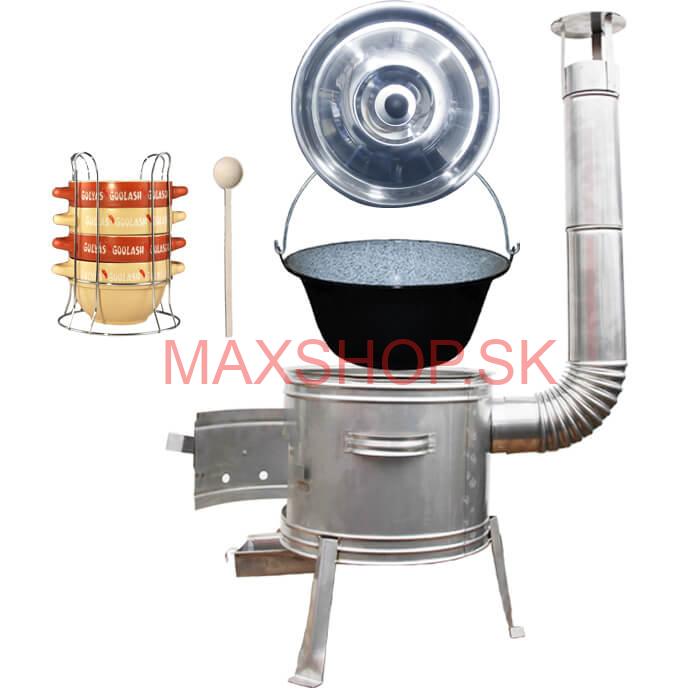Kotlíková súprava na varenie gulášu, pečenie a grilovanie klobás, steakov, špekáčikov, slaniny, mäsa, zeleniny a iných pochutín v záhrade, v prírode pre rodiny, rôzne spoločenské akcie a posedenia pri dobrom guláši a grilovaní.
