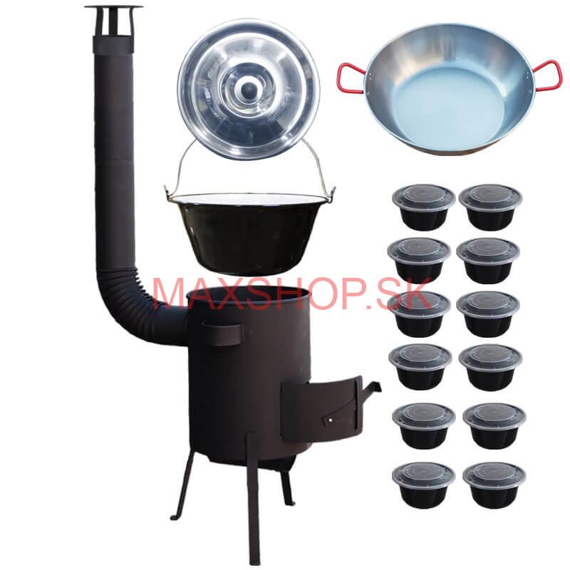 Smaltovaný kotlík 22 L + panvica PAELLA (WOK) 45 cm + žiaruvzdorná kotlina 42 PLUS 600 s roštom na popol 4 mm+ nerezová pokrievka + plastové boxy (misky) s vrchnákom 12 ks